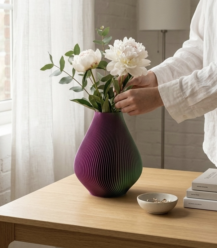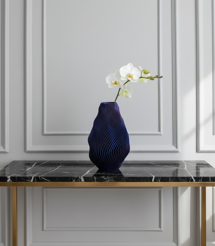 Crafted using advanced 3D printing technology, the vase is built layer by layer with millimeter precision. This process enables intricate textures and complex forms that are difficult to achieve through traditional methods.