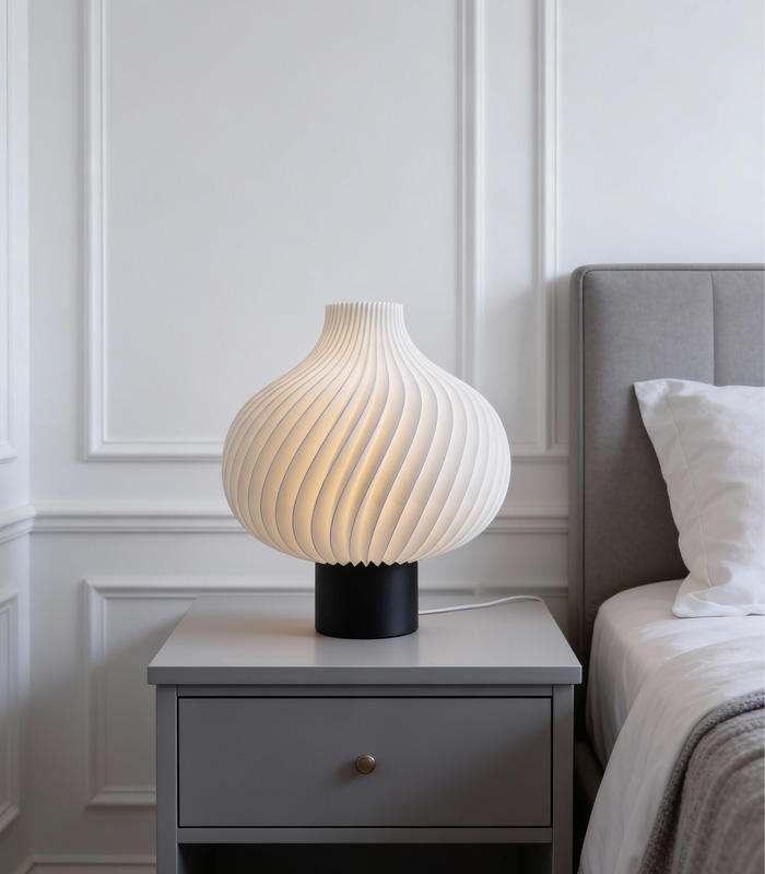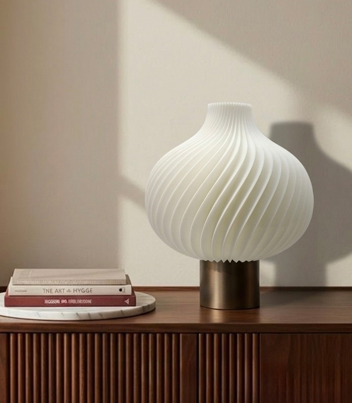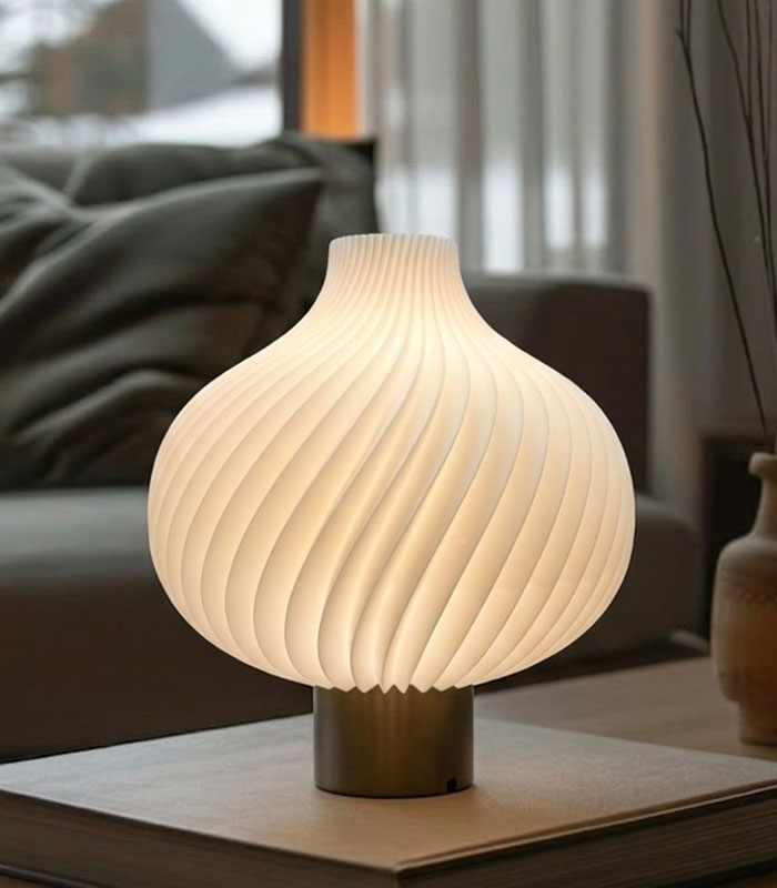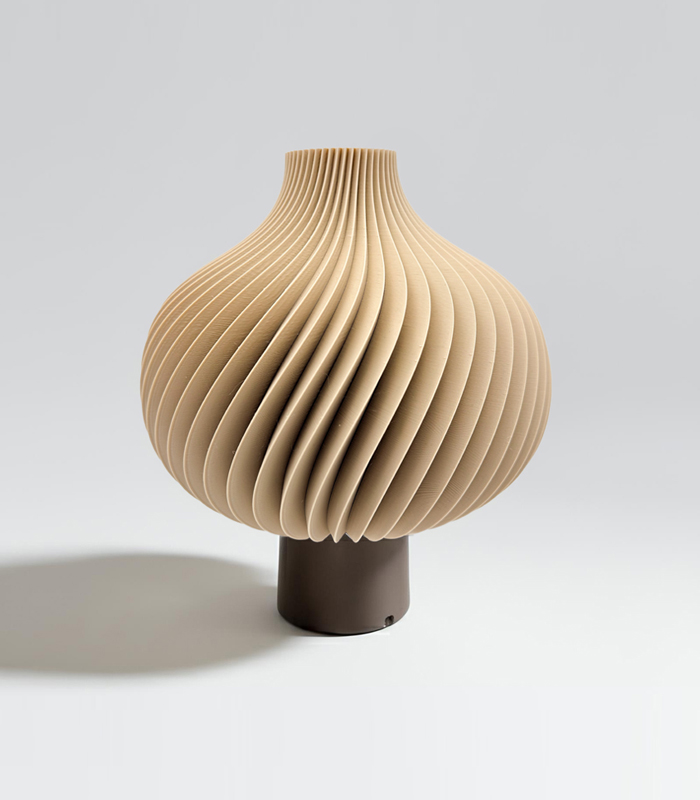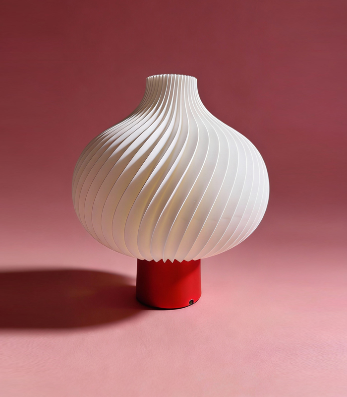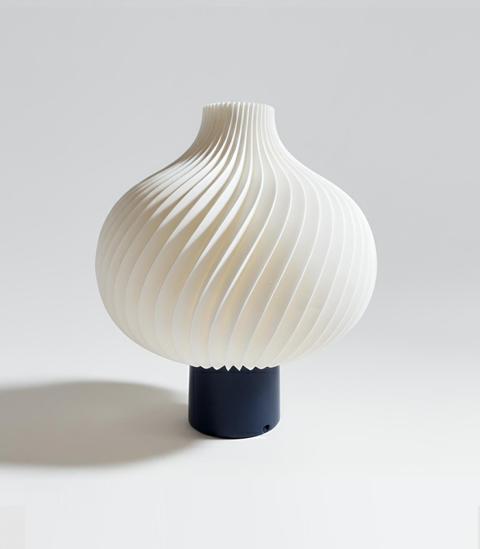 The Ora Table Lamp is a unique member of the popular Plissé collection. Its design is inspired by the delicate and rhythmic folds of pleated fabrics in classic fashion. The goal was to shape a solid material in a way that makes it appear soft and flexible -seemingly frozen in a beautiful twisting motion.