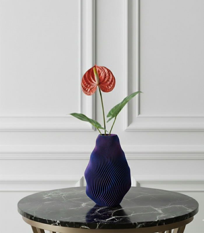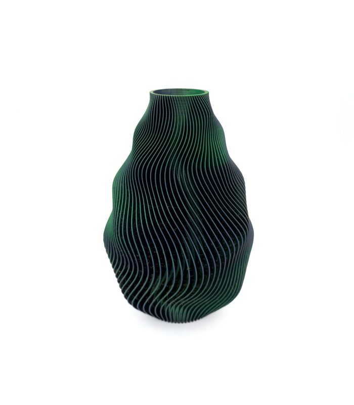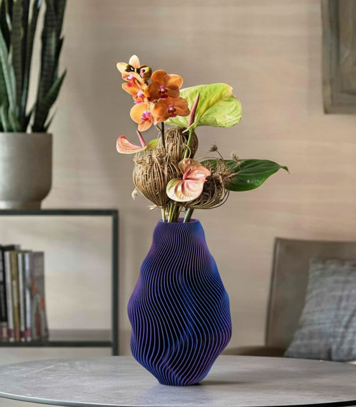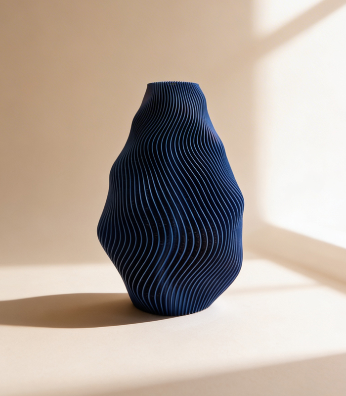 Die Vela Vase mit ihrer asymmetrischen Form und den vertikalen Wellenrillen bringt Dynamik und natürlichen Fluss in jeden Raum. Das Zusammenspiel der beiden Filamentfarben am Körper verwandelt jeden Betrachtungswinkel in ein einzigartiges Spiel aus Licht und Schatten und lässt die Vase so wirken, als ob sie mit der natürlichen Energie ihrer Umgebung interagiert.