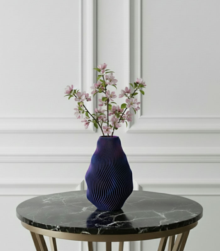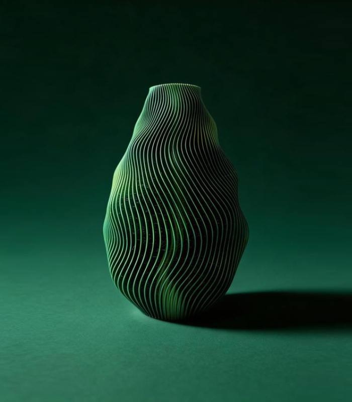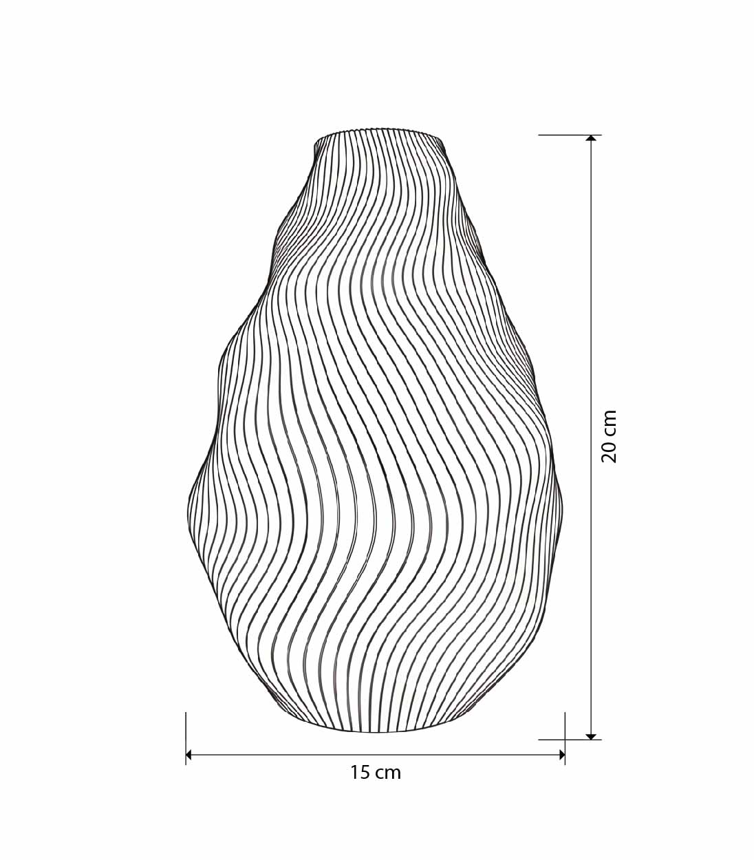 Vela wird mit hochpräzisem 3D-Druck gefertigt. Tausende feiner Schichten aus zwei Filamentfarben werden übereinandergeschichtet, um diese wellenförmige, natürliche Form zu erzeugen. Kleine Unterschiede in jedem Stück verstärken die Einzigartigkeit und die künstlerische Authentizität der Vase.